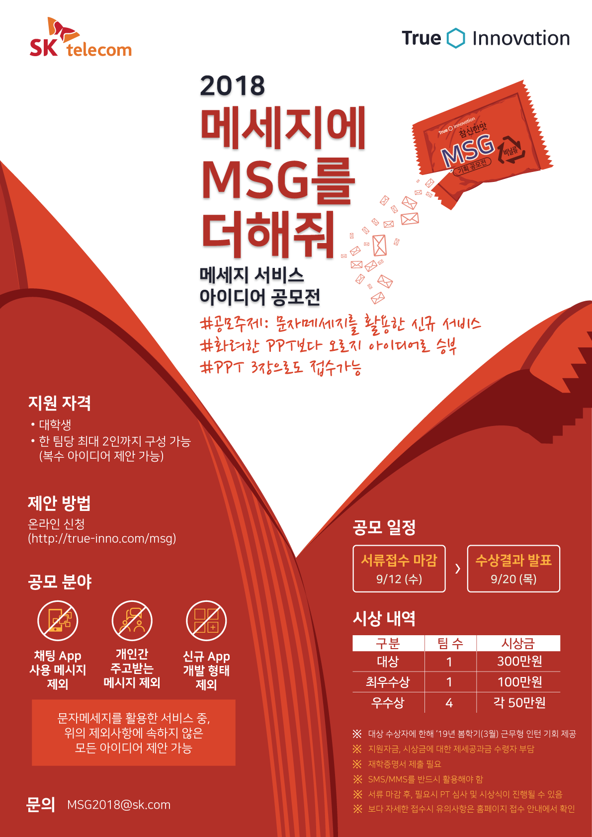 접수방법 : 본 페이지 첨부문서를 다운 받은 후 작성하여 MSG2018@sk.com 으로 보내면 공모전 접수가 완료됩니다. (접수는 마감일인 9월 12일 23시 59분까지 도착한 메일까지만 유효합니다 )